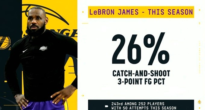 詹姆斯接球出手三分命中率低至26% 至少出手50次球员中排243位